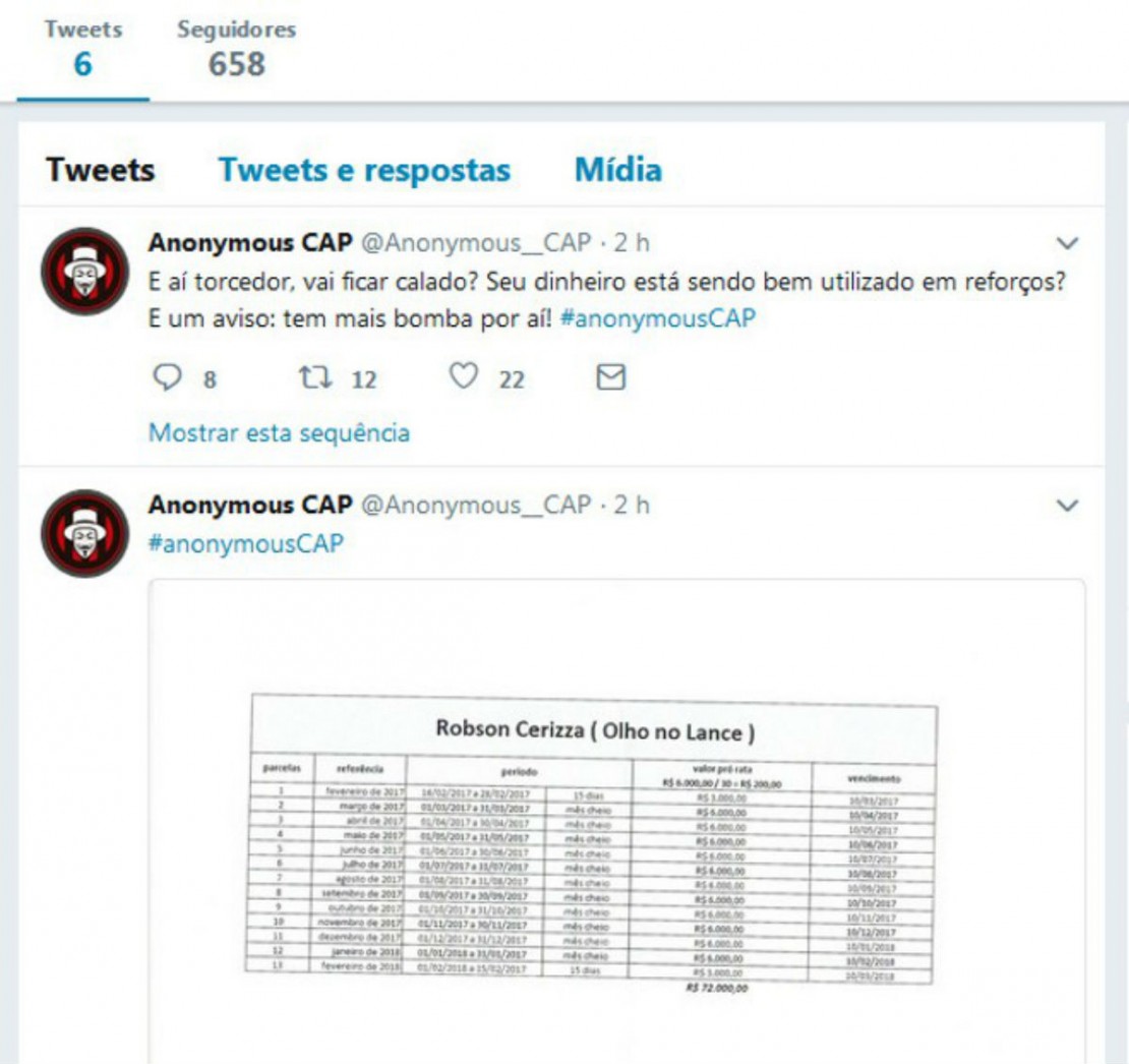 Uma postagem no perfil do Twitter Anonymous_CAP trouxe à luz um contrato de prestações de serviços um tanto quanto peculiar. Na lista de pagamentos de Atlético, consta um valor mensal R$ 6 mil pago a Robson Cerizza por serviços de consultoria de comunicação ao Conselho Deliberativo. No total, durante 2017, o “consultor” recebeu a bolada de R$ 72 mil.