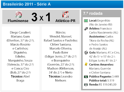 Apagado no jogo, o meio-campista Branquinho deu lugar para o equatoriano Guerrón, na primeira modificação do Atlético. Na sua primeira participação, o gringo foi amarelado por segurar a bola na mão. Logo depois, Niehues apostou nas entradas do jovem Edigar na vaga do cansado Paulo Baier e Kleberson no lugar de Madson. O Rubro-Negro chegou ao gol através de Edigar, aos 41min, em uma bela cabeçada. Mas, ficou assim: Fluminense 3×1 Atlético.