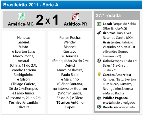 O Coelho, já rebaixado, prometia complicar as coisas para o Furacão. Conseguiu. Venceu o Atlético por 2 a1 deixando jogadores desolados. A torcida, que foi em peso para Minas Gerais, cantou até o fim, mas saiu triste do Parque do Sabiá.