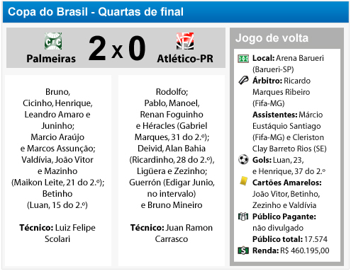 O Atlético Paranaense não conseguiu bater o Palmeiras no caminho para as semifinais da Copa do Brasil 2012 na noite desta quarta-feira (23). O time de Carrasco precisava de uma vitória simples contra o Alviverde, mas acabou perdendo por 2 a 0. O resultado deu a vantagem para o Palmeiras, uma vez que o primeiro jogo, em Curitiba, acabou em empate por 2 a 2.