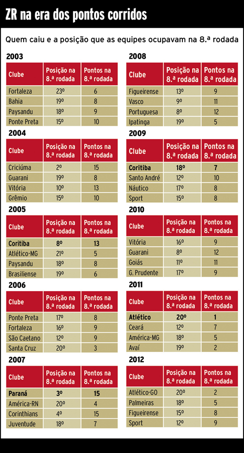 O Furacão, aliás, já foi vítima desta probabilidade. Em 2011, quando foi rebaixado, na 8.ª rodada do campeonato o Furacão tinha apenas um ponto e ocupava a lanterna da competição. O Avaí, com 2 pontos, e o América-MG, com 5, também estavam na ZR. Ao final da disputa, os três não evitaram o descenso. Em outros anos, pelo menos dois times que estavam na área de risco do Brasileirão, até a 8ª rodada, não conseguiram escapar da degola. Isso aconteceu nas edições de 2005, 2006, 2007, 2009 e 2012.