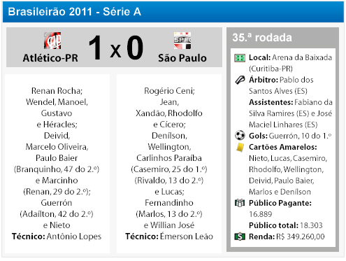 Em mais uma decisão neste Campeonato Brasileiro, o Atlético enfrentou o São Paulo, na noite desta quarta-feira, na Arena da Baixada, e venceu por 1 a 0. Com o resultado, a situação do Furacão melhora na tabela de classificação. O time da Baixada agora é o 17º colocado, com 37 pontos ganhos.
