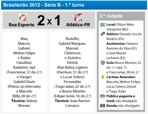 Aos 38 minutos, o lance que mudou o rumo da partida. O técnico do Boa, Sidney Moraes, promoveu a entrada do meia Francismar. Alguns segundos depois, o mesmo Francismar aproveitou o rebote de Rodolfo de um chute de Vanger e virou o jogo para os mineiros. Festa da torcida local.