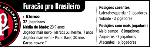 No Campeonato Brasileiro, o Atlético vai a campo com o time-base de 2012, mas com um elenco renovado. Explica-se. Ao ir às compras, o Furacão não trouxe nomes capazes de desbancar os titulares que ficaram em 3.º lugar na Série B do ano passado, mas apenas peças de reposição para o técnico Ricardo Drubscky.