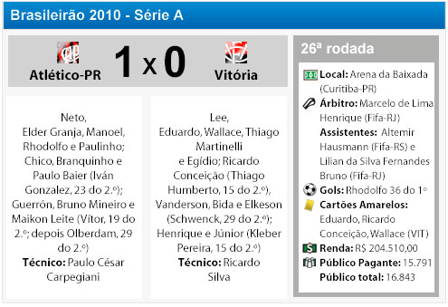 O Atlético venceu o Vitória por 1 a 0 na partida da noite desta quarta-feira (29), na Arena da Baixada, em Curitiba. O único gol da partida, A partida, válida pela 26ª rodada do Brasileiro, foi marcado de cabeça por Rhodolfo.