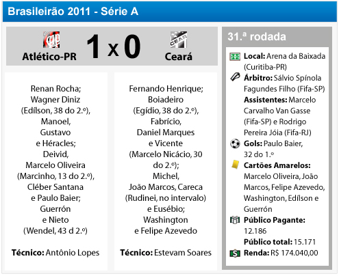 Em clima de decisão, o Atlético recebeu o Ceará, na tarde deste domingo, na Arena, e venceu por 1 a 0. Com o resultado, o Furacão ainda segue na zona de rebaixamento, na 18ª posição, mas agora com 31 pontos ganhos e mais próximo de sair da degola. Próximo desafio será o Santos, no sábado, 18 horas, na Vila Belmiro.