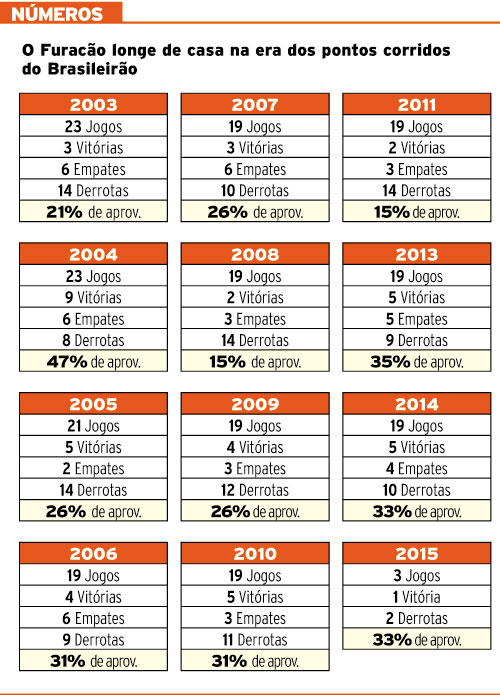 Jogar longe de casa tem sido, na era dos pontos corridos, um dos principais problemas do Atlético. De 2003 até agora, com exceção da temporada de 2012, quando o Furacão disputou a Série B, o time atleticano nunca conseguiu mais de 50% de aproveitamento jogando fora de casa. Sua melhor marca aconteceu em 2004, quando foi vice-campeão brasileiro e marcou 47% de rendimento nas partidas longe da Arena da Baixada.