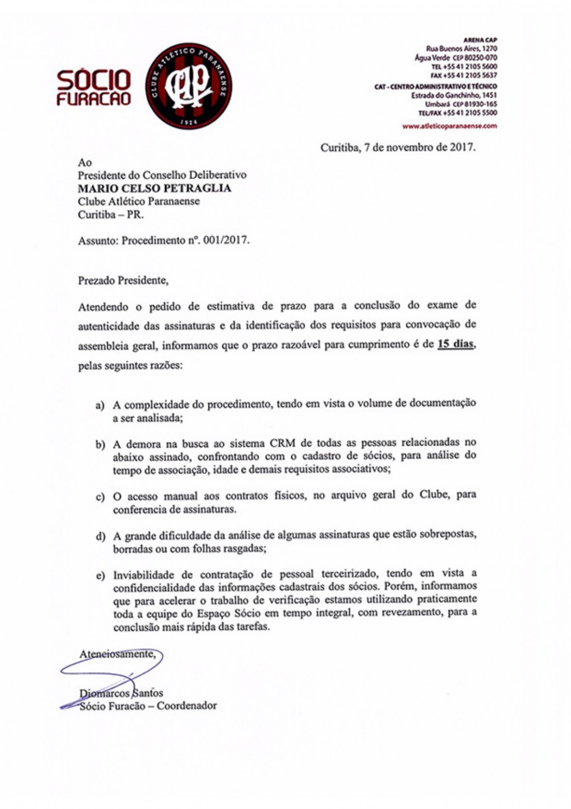 A espera por uma Assembleia Geral de sócios no Atlético será maior do que a se planejava. Nesta terça-feira (7), o clube emitiu uma nota, onde o coordenador do Sócio Furacão, Diomarcos Santos, informou o presidente do Conselho Deliberativo, Mario Celso Petraglia, de que serão necessários 15 dias úteis para dar um parecer sobre o exame de autenticidade das quase quatro mil assinaturas coletadas no mês passado.