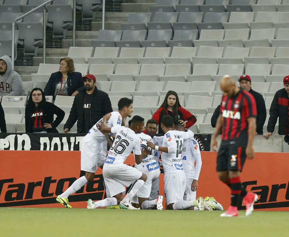 O Santos só esperava a hora certa para encaixar um contra-ataque. Quando teve a chance, mandou ver. Sidcley e Matheus Rossetto trocavam passes e o volante perdeu a bola para Bruno Henrique, que arrancou e tabelou com Thiago Maia. O Atlético estava todo desarrumado, e foi fácil deixar Kayke na cara do gol. O ex-atacante do Paraná Clube abriu o placar e começou a transformar a esperança rubro-negra em angústia na Arena.