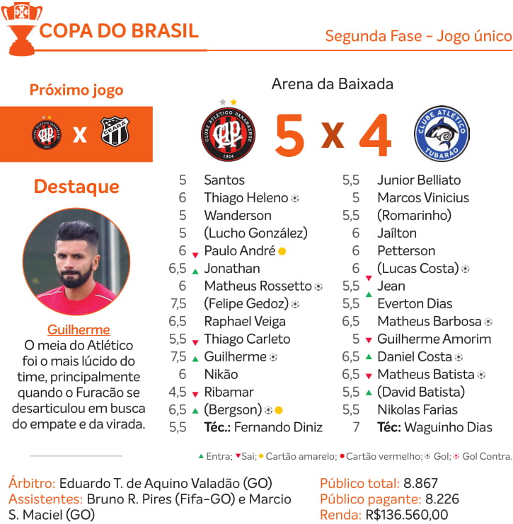 Eram quase 20 minutos do segundo tempo, e o Atlético perdia para o Tubarão por 2×1 em plena Arena da Baixada. Foi quando o técnico Fernando Diniz chamou Pablo para entrar na equipe. Ouviu xingamentos e gritos de “burro” vindos da torcida e pedidos por Felipe Gedoz. O meia não é um jogador adorado dentro do CT do Caju. Isto desde os tempos de Paulo Autuori. Ele não é um, digamos assim, atleta exemplar. Dia desses, inclusive, foi cobrado pelo treinador – que, estava claro, não estava a fim de colocá-lo no jogo desta quarta-feira (21). Mas quando a coisa apertou, foi Gedoz quem entrou. Como a torcida queria. E foi ele quem marcou um golaço aos 48 minutos, o gol da classificação na inacreditável vitória por 5×4 que colocou o Rubro-Negro na terceira fase da Copa do Brasil, para enfrentar o Ceará, com a primeira partida na próxima quarta (28), em Curitiba.