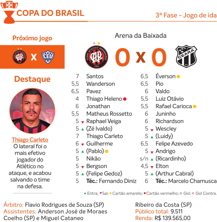 Ficou tudo para Fortaleza. Jogando com um a menos desde os 23 minutos do primeiro tempo, o Atlético ficou no empate em 0x0 nesta quarta-feira (28) com o Ceará, no jogo de ida da terceira fase da Copa do Brasil. A atuação foi novamente abaixo do esperado, mas o resultado pelo menos manteve a disputa aberta para o jogo da volta, no dia 15, no Castelão. E novamente a ousada estratégia de jogo do técnico Fernando Diniz deixou o Furacão em dificuldades.