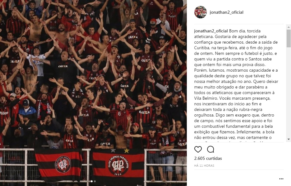 O lateral-direito Jonathan publicou em sua conta no Instagram nesta sexta-feira (11) um agradecimento à torcida do Atlético. No texto, ilustrado com uma foto dos torcedores do Furacão na Vila Belmiro, do fotógrafo Albari Rosa, ele promete que o time irá “fazer de tudo” para conquistar uma vaga na Libertadores de 2018.