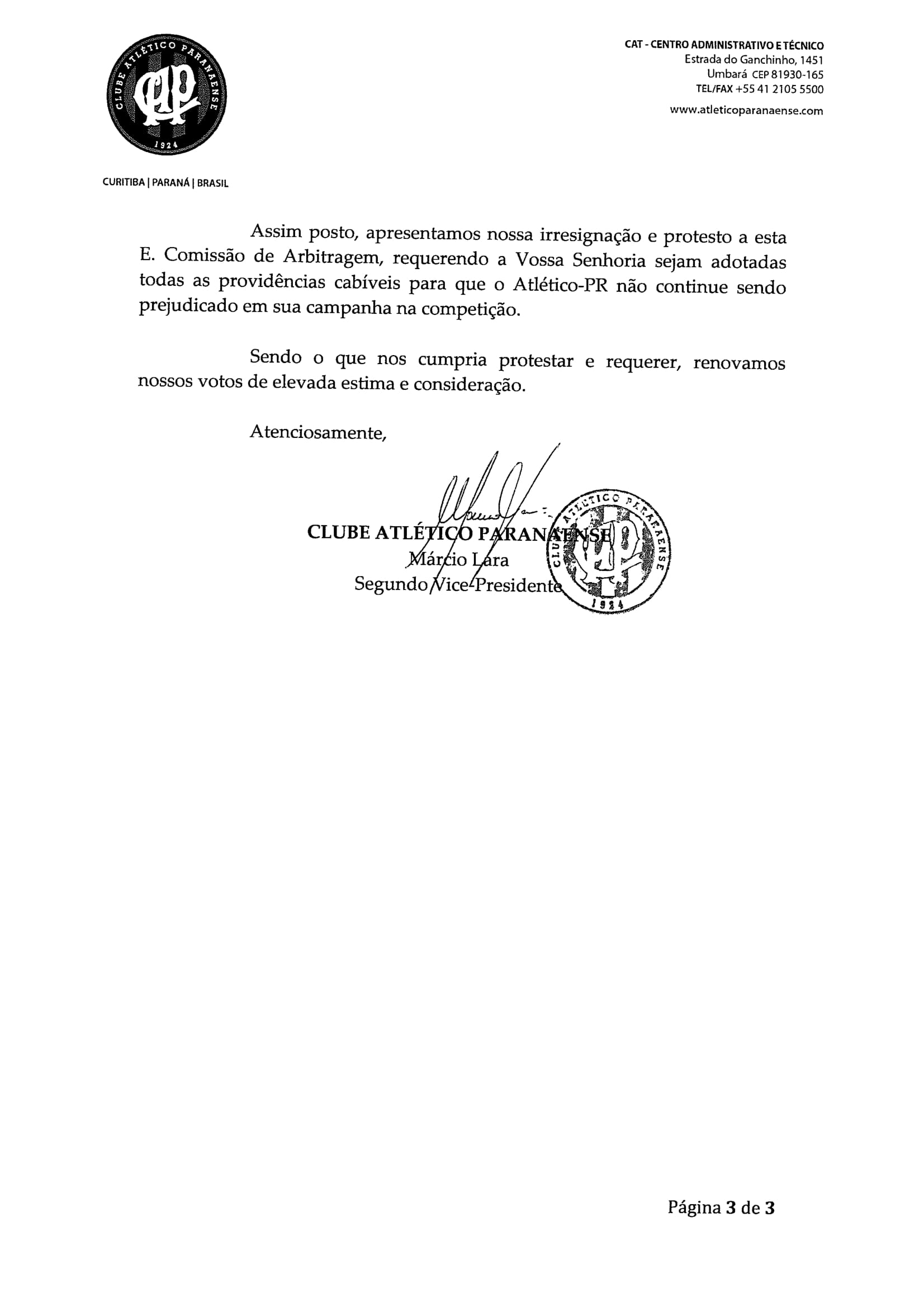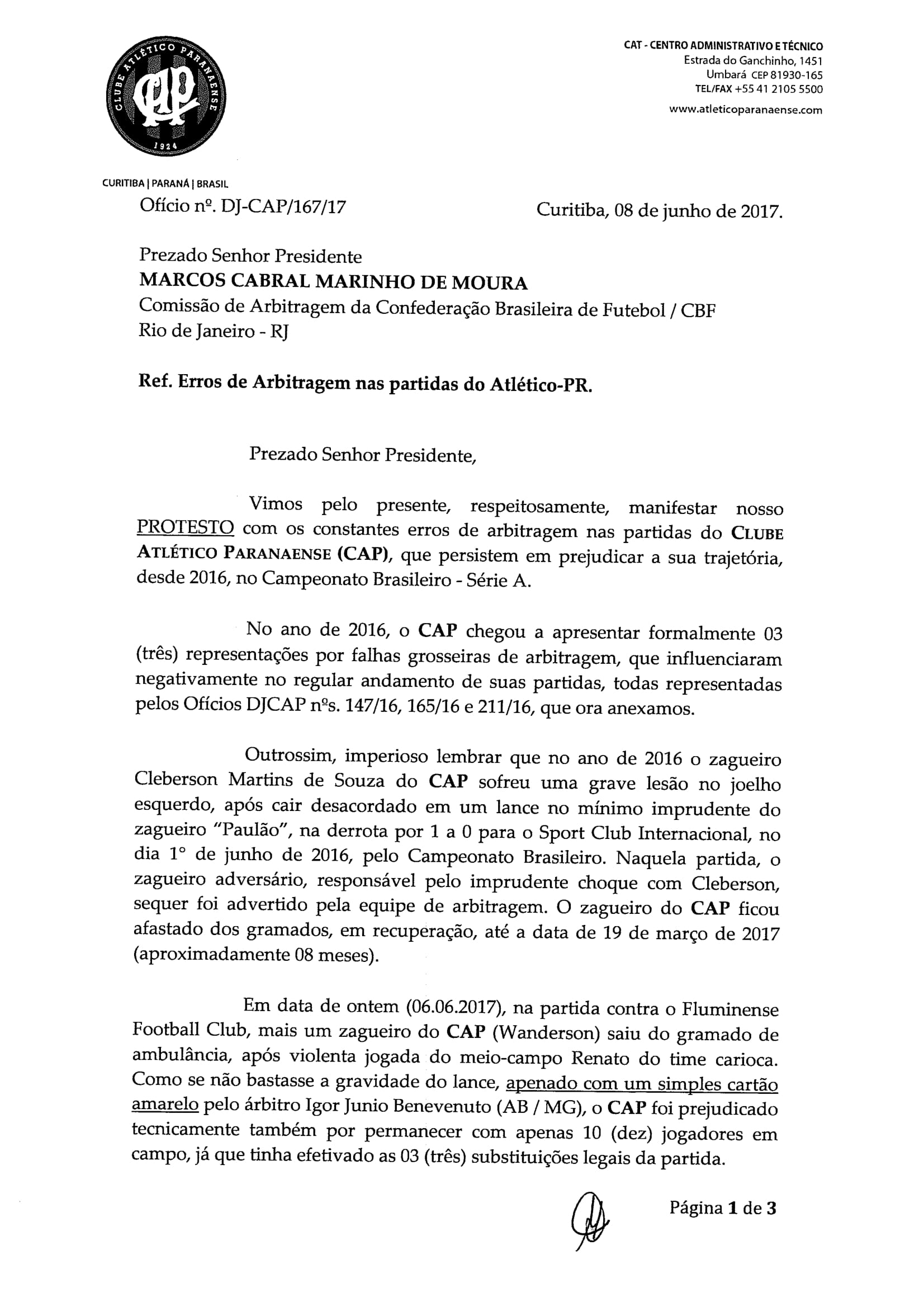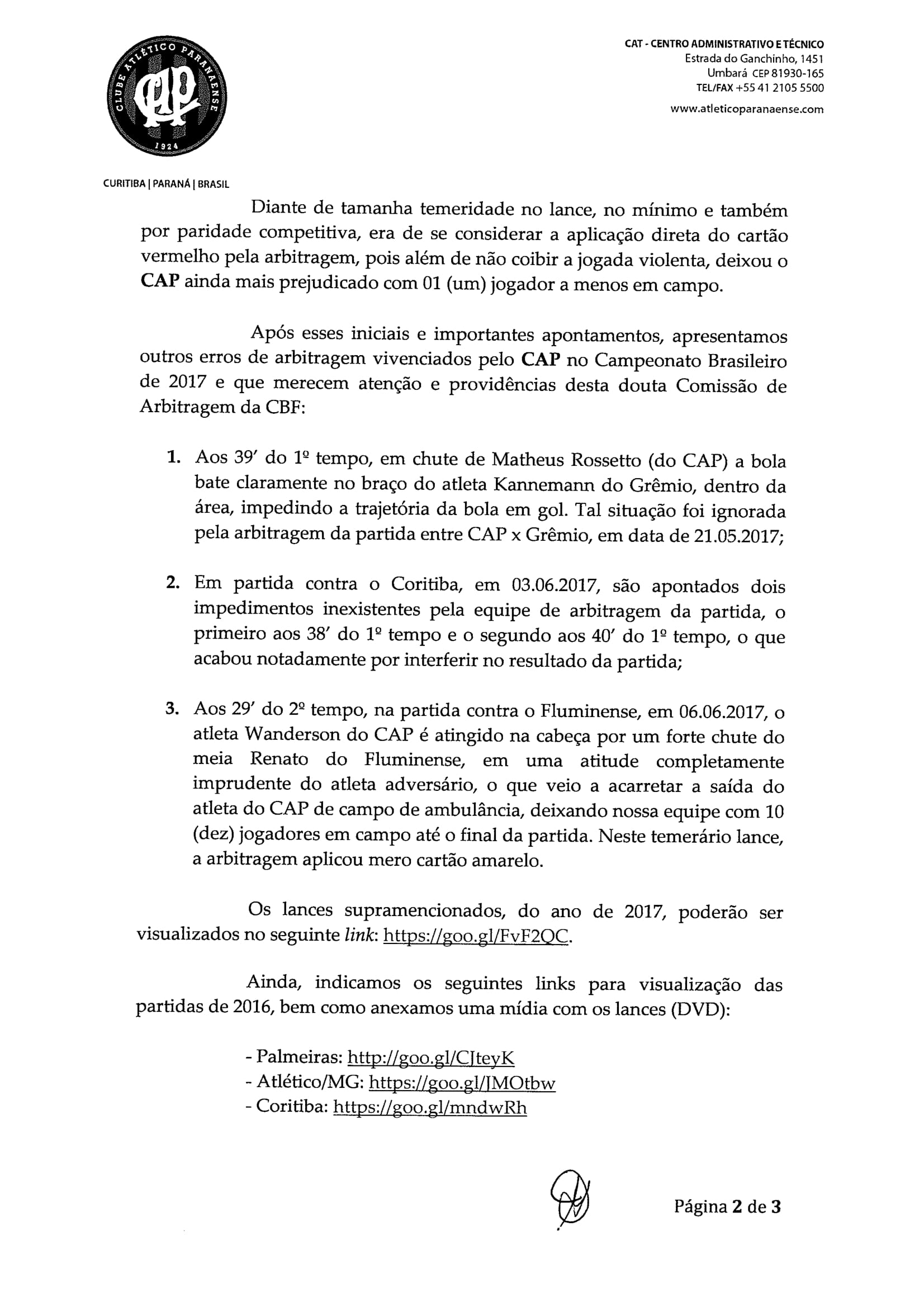 Além do relato dos lances, feito em três páginas, o Atlético enviou um DVD com lances de 2017 e também de 2016, para que “sejam adotadas todas as providências cabíveis para que o Atlético-PR não continue sendo prejudicado em sua campanha na competição”, como diz o final do ofício.