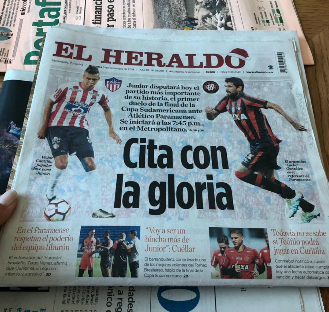 O periódico, que é um dos principais da cidade, estampou a grande final na capa da edição desta quarta-feira com a manchete: “Cita con la gloria”. Ainda na capa, o jornal trata o duelo diante do Furacão como o mais importante da história do Junior Barranquilla.