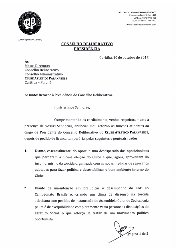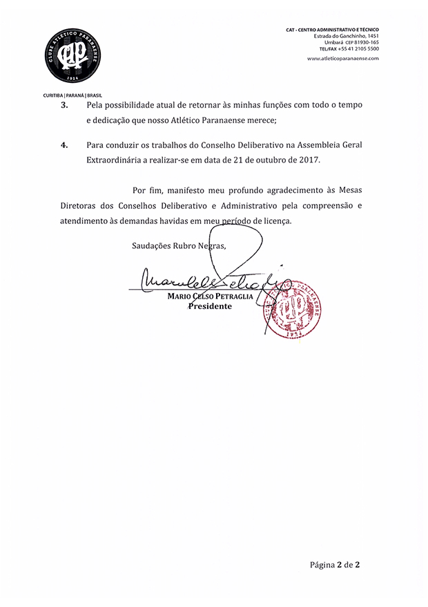 Mário Celso Petraglia está de volta. Não que ele tenha saído do Atlético de fato, mas nesta sexta-feira (20), o clube anunciou em nota oficial o retorno do homem forte do Furacão ao posto de presidente do Conselho Deliberativo, posto do qual havia se afastado em julho. Coincidência ou não, isto acontece quando está prevista uma reunião extraordinária do “conselhão” e no meio de uma crise com torcedores e oposição, que tentam juntar assinaturas para a realização de uma Assembleia Geral.
