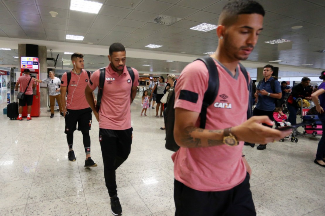 Nada de música alta, papo descontraído ou brincadeiras. Nem mesmo o atraso do voo mudou isso. Aguardando o embarque, tentando não sentir o cansaço da espera, alguns jogadores aproveitavam para tomar café, como foi o caso do lateral-direito Jonathan, outros ficaram um bom tempo no celular, como foi o caso do zagueiro Léo Pereira, enquanto outros permaneceram sentados no chão, como os atacantes Marcelo Cirino e Pablo, já que a área de embarque estava cheia, com poucos assentos disponíveis.