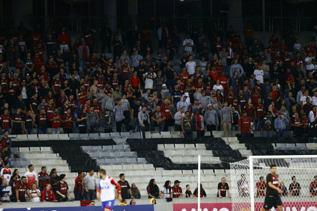 Apesar da goleada por 4×1 sobre o Bahia, que colocou o Atlético no G6 do Campeonato Brasileiro, nem tudo foi festa na Arena da Baixada no último domingo (13). Membros da torcida organizada Os Fanáticos foram vestidos de cinza e, no decorrer do jogo, acabaram protestando escrevendo com um plástico preto as iniciais TOF (Torcida Os Fanáticos) em um espaço vazio nas arquibancadas.