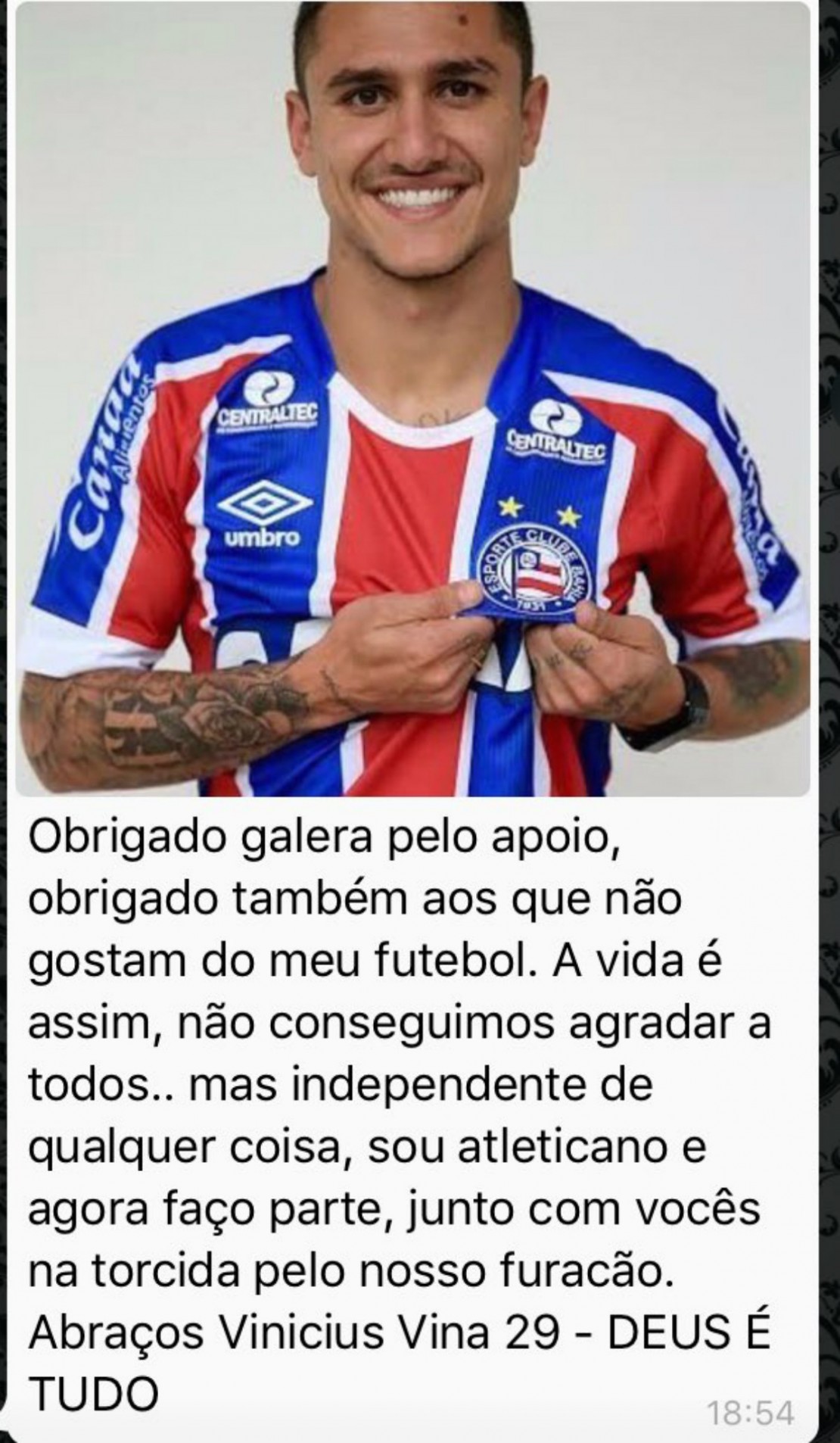 “Obrigado galera pelo apoio. Obrigado também aos que não gostam do meu futebol. A vida é assim, não conseguimos agradaro a todos, mas independente de qualquer coisa, sou atleticano e agora faço parte, junto com vocês, na torcida pelo nosso Furacão”, postou ele.