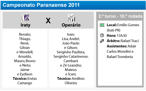 O clássico dos Campos Gerais vai colocar frente a frente dois rivais em posições distintas no Paranaense 2011. No Emílio Gomes, enquanto o Iraty entra em campo tentando se livrar do rebaixamento, o Operário chega focado em garantir antecipadamente a presença na final do interior.