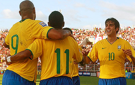 Brilhou a estrela do trio Robinho, Kaká e Adriano e em ritmo de treino o Brasil aplicou uma sonora goleada por 4 a 0 sobre a Venezuela fora de casa no fim da tarde deste domingo (12). O resultado positivo, por enquanto, aliviou a barra do contestado técnico Dunga. Foi a segunda vitória longe do Brasil nestas Eliminatórias.