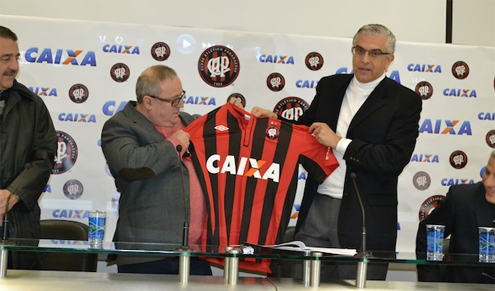 O Atlético oficializou ontem o contrato de patrocínio com a Caixa Econômica Federal (CEF). O acordo, já antecipado pela Tribuna na edição de sábado passado, inicialmente teria duração de seis meses, mas será estendido por mais um ano. Extraoficialmente, a parceria renderá ao clube em torno R$ 5,4 milhões. “É o maior contrato da nossa história”, disse o presidente atleticano, Mário Celso Petraglia, durante o ato de assinatura.