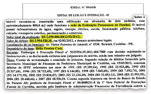 A Federação Paranaense de Futebol está novamente com seu patrimônio em risco. Desta vez, terá a sede levada a leilão com lance inicial de R$ 2.690 milhões. A situação é semelhante à que aconteceu com o Estádio Pinheirão, em outubro do ano passado, e também por conta de dívidas com o Instituto Nacional do Seguro Social (INSS). O valor estipulado na nova ação é para pagamento de R$ 3.954.528,18 de débito com o INSS, que corresponde apenas parte das dívidas da Federação – estimadas em perto de 40 milhões.