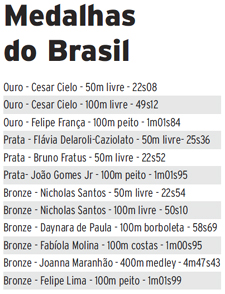 O Brasil, no entanto, foi quem se destacou. Com as conquistas do ouro de Cesar Cielo e bronze de Nicholas Santos nos 100m livre, o país ficou com 12 medalhas obtidas ao todo.