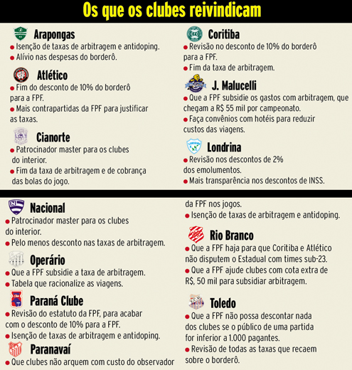O descontentamento é geral. Há consenso entre os clubes de que a Federação Paranaense de Futebol deve passar a arcar com as taxas de arbitragem, custear a presença do observador nas partidas e rever a cobrança dos emolumentos – desconto de 2% sobre a renda bruta das partidas para pagar as confecções dos ingressos. “Antes, quando os bilhetes eram impressos para cada partida, se justificava esse gasto. Mas hoje são cartões magnéticos que são reaproveitados de um jogo para o outro. Mesmo assim, continuam sendo descontados 2% por jogo. Sou favorável a questionarmos vários gastos, apesar de o presidente ser autoritário e não aceitar questionamentos”, denuncia o presidente do Londrina, Cláudio Canuto.