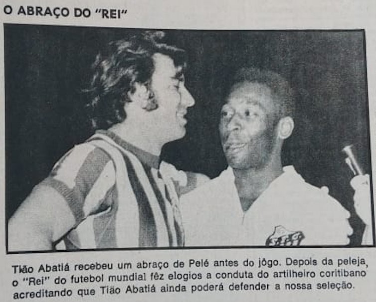 A foto de Abatiá abraçando Pelé após o apito final estampou a reportagem na Gazeta do Povo à época. “Depois da peleja, o Rei do futebol mundial fez elogios à conduta do artilheiro coritibano acreditando que Tião Abatiá ainda poderá defender a nossa seleção”, dizia a legenda.