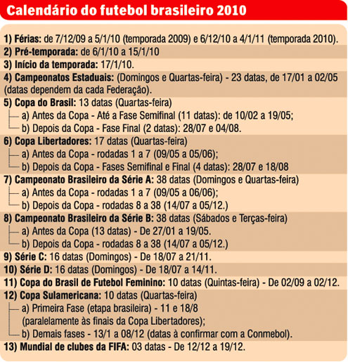 Com uma “entressafra” de 40 dias por causa da Copa do Mundo da África do Sul, o calendário do futebol brasileiro para 2010 foi divulgado ontem pela CBF. A temporada começa oficialmente em 16 e 17 de janeiro, com os campeonatos estaduais.