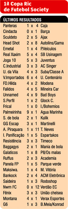 Foi realizada durante a semana a 2.ª rodada da 1.ª Copa RIC de futebol society. Os destaques da rodada ficaram por conta das vitórias das equipes P8/Os Malas que goleou por 8 a 1 os Galáticos Aurora. A P8/Os Malas tem entre os seus craques o meia atacante Perdigão, campeão mundial interclubes pelo Internacional e ex-jogador do Paraná Clube e Atlético.
