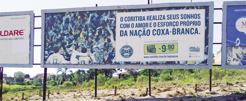 O Coritiba espalhou outdoors em várias regiões da capital, para divulgar seu plano de sócios. Porém, aproveitou o espaço para cutucar o rival Atlético. Com os dizeres “O Coritiba realiza seus sonhos com o amor e o esforço próprio da nação coxa-branca”, o clube atinge as obras da Arena da Baixada, que estão sendo realizadas com dinheiro público. Com diz o ditado: pra bom entendedor…