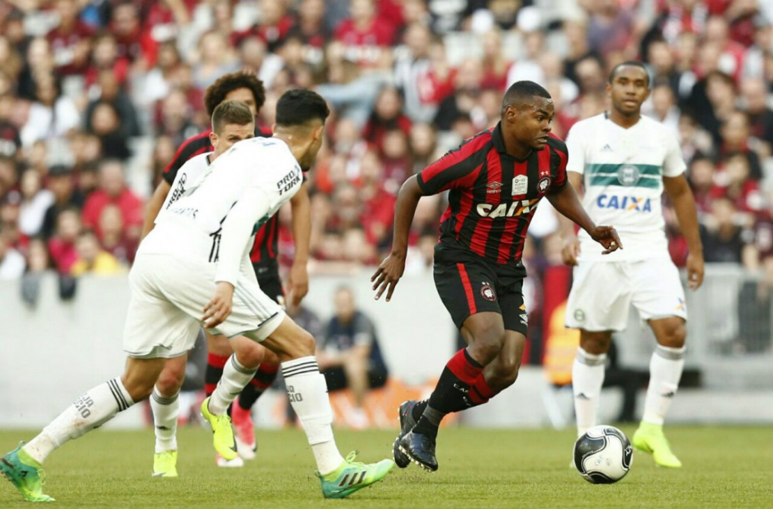 Com os jogadores abertos pelas pontas, o Coxa se lançava rapidamente pra cima, principalmente com Iago. Independentemente do lado que caía, o camisa 7 era quem arrancava para cima dos defensores atleticanos. Tanto que foi assim que ele marcou um golaço na Arena, encobrindo Weverton, após jogada pela esquerda.