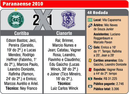 O jogo, que aconteceu na Vila Capanema, foi válido pela quarta rodada do Campeonato Paranaense 2010. Rafinha e Enrico marcaram para o Coxa e Jean diminuiu para o Leão do Vale, que continua com seis pontos e em quarto lugar na classificação.