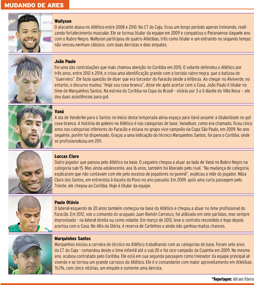Com a chegada de Wallysson, o Coritiba completou um quinteto de ex-atleticanos no atual elenco. São cinco jogadores com passagem no grande rival. Além dos atletas, o técnico Marquinhos Santos é outro que já trabalhou no Rubro-Negro. Confira os “vira-casacas” que estão no Alto da Glória.