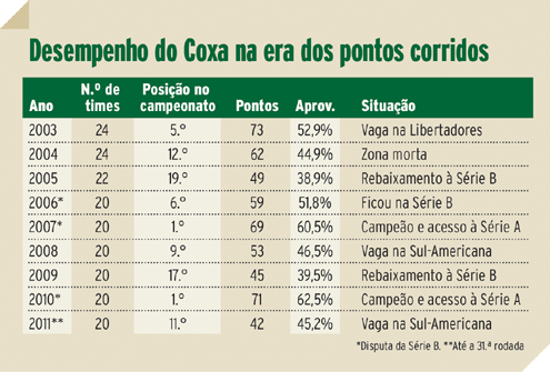 Apesar do discurso das chances matemáticas de classificação para a Libertadores do ano que vem, o modesto 11.´ lugar no Campeonato Brasileiro mostra a irregularidade do Coritiba desde que a competição adotou o sistema de pontos corridos. Tirando os dois títulos na Série B, em 2007 e 2010, somente em 2003 o Alviverde foi realmente competitivo na disputa. Foi quando conquistou uma vaga no principal torneio continental. Nos demais anos, o Coxa alternou campanhas medianas como a desta temporada, e as de 2004 e 2008, com os desastres em 2005 e 2009, quando foi rebaixado.