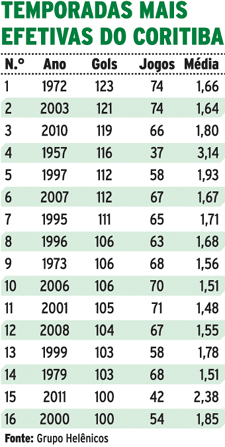 Apesar dos números possíveis, o Coritiba dificilmente conseguirá superar a média de 3,14 gols marcados por partida em 1957. Naquele ano, o time atropelou os adversários, foi bicampeão paranaense e conseguiu incríveis 116 gols em 38 jogos, com o ataque formado por China, Miltinho, Duílio, Almir e Ronald. Em 1972, o ataque alviverde que balançou as redes 123 vezes tinha Paquito, Tião Abatiá e Zé Roberto como titulares.