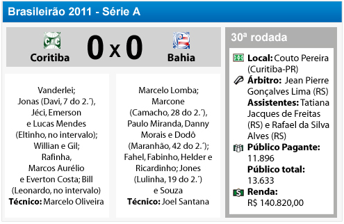 O Coritiba recebeu o Bahia, no fim da tarde deste domingo, em sua casa, o estádio Couto Pereira. A tarde fria e cinza não assustou a torcida alviverde, que compareceu ao estádio para prestigiar sua equipe. A missão coxa-branca era garantir os três pontos dentro de casa, para continuar sonhando com o acesso ao G5, mas um empate em 0 a 0 esfriou bastante os ânimos da equipe.