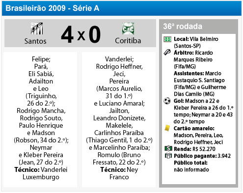 Aos 24, Jeci parou Neymar com falta dentro da área: pênalti. Kleber bateu mal e Vanderlei fez a defesa. Aos 43, Neymar recebeu de Ganso e tocou por cobertura fazendo um belo gol dando números finais a partida. Final: Santos 4, Coritiba 0.