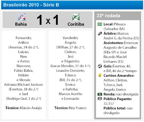 Precisando vencer ou, ao menos, empatar para continuar na liderança da Série B, o Coritiba enfrentou o Bahia na noite desta terça-feira, fora de casa, e empatou em 1 a 1.