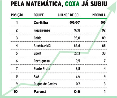 Todos os cálculos matemáticos realizados após a 31.ª rodada da Série B colocam o Alviverde na Primeira Divisão de 2011. Na planilha do site chancedegol.com.br, o Coxa tem 99,97% de possibilidades de acesso, enquanto o site Infobola dá 99% de probabilidade para o clube do Alto da Glória retornar á Série A.