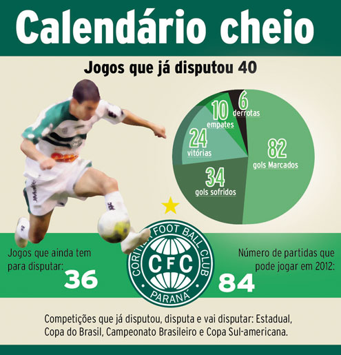O empate por 2 x 2 contra o Santos, no domingo passado, foi a partida de número 40 do Coritiba neste ano. A marca é expressiva, se levar em conta que se passaram apenas seis meses da temporada 2012, mas a torcida poderá ver muito mais jogos do Coxa neste ano. O clube já tem garantido o recorde de partidas em toda a sua história. No total, o Alviverde chegará, no mínimo, a 76 jogos na temporada, podendo chegar a 84. O certo é que, com o calendário atual, já superou a marca de 74 confrontos disputados 1972 e em 2003.