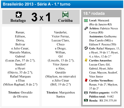 Minutos depois, o volante Gil foi derrubado pelo goleiro Renan na área do Botafogo. O arqueiro foi expulso e o meio-campo Alex diminuiu o marcador para o Coxa.