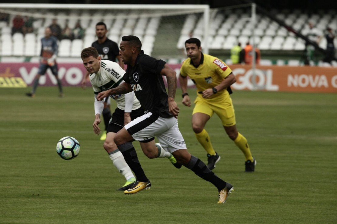 Com dificuldades para sair da marcação do Botafogo e apostando muito nas bolas alçadas na área, o Coritiba teve a chance de abrir o placar aos 31 minutos. Rildo cruzou e a bola bateu na mão de Rodrigo Lindoso dentro da área. Mas pênalti não é o forte do Coxa neste Brasileirão. Thiago Carleto bateu e Gatito Fernandez defendeu. Mas logo depois, o lateral alviverde se redimiu, cobrou bem a falta e Werley abriu o placar de cabeça.