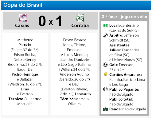 O Coritiba passou a tocar melhor a bola e a dominar a partida. Aos 13 minutos, Leonardo recebeu cara a cara com o goleiro, mas bateu em cima de Matheus. O Coritiba seguia melhor no jogo e aos 27 minutos chegou a marcação do gol. Rafinha cobrou falta para área e Emerson apareceu bem para marcar de cabeça. Final: Coritiba 1, Caxias 0.