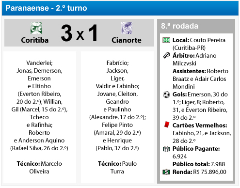 A torcida do Coritiba está mais líder do que nunca. O Coxa passou pelo Cianorte, pelo placar de 3 a 1, e abriu uma ligeira vantagem do segundo colocado, seu arquirrival Atlético, que está quatro pontos atrás do Verdão. O jogo ficou marcado pelo 18° gol com a camisa alviverde do zagueiro Emerson, que junta-se a Zambiasi como os maiores zagueiros-artilheiros do Coritiba. Além de Emerson, Roberto e Everton Ribeiro marcaram para o Coxa. Ligger descontou pros visitantes.