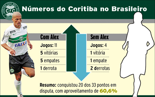 Atual sexto colocado com 24 pontos, o Coritiba vive seu pior momento técnico até aqui dentro do Campeonato Brasileiro. Não por coincidência, o aproveitamento do Alviverde quando o meia Alex deixou o time para tratar de duas lesões praticamente caiu pela metade: com seu principal jogador em campo a equipe conquistou 60,6% dos pontos disputados, com aproveitamento de G4. Sem o poder de definição do camisa 10 nas últimas rodadas o número despencou para 33,3%.
