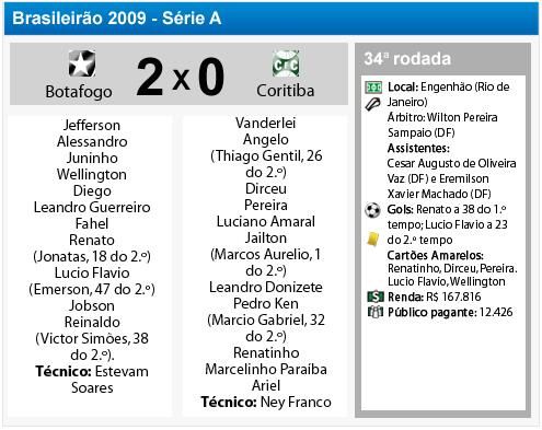 O meia botafoguense fez grande jogada com Diego e fuzilou entre o arqueiro e a trave. Era o prenúncio de uma goleada. O Botafogo continuou pressionando e obrigou o treinador do Coritiba a mudar a equipe.