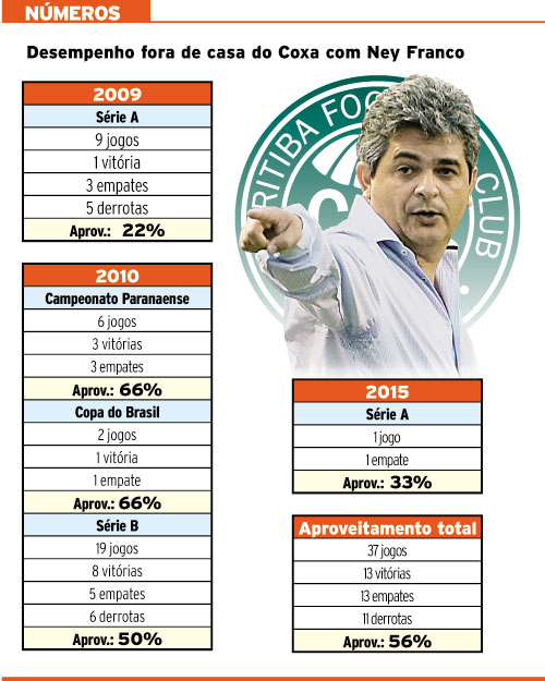 Neste ano, Ney Franco, mesmo com pouco tempo de trabalho, provou no clássico Atletiba que tentará dar novos rumos para o Coritiba nas partidas fora de casa. O empate em 2×2 na Arena da Baixada foi o único ponto conquistado pelo Coxa até agora jogando longe do Couto Pereira neste Brasileirão.