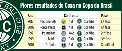 Se quiser continuar disputando a Copa do Brasil 2013, o Coritiba terá que realizar um feito inédito: quebrar a escrita de nunca, ao longo das 24 edições anteriores do torneio, ter conseguido reverter placares elásticos. Para complicar a situação, a desastrosa atuação frente ao Nacional-AM, quarta-feira passada, igualou o pior placar de todas as campanhas do Alviverde. Em 2002, o Coxa também foi goleado por 4 x 1 pela Ponte Preta. Naquele ano, a Macaca – time que poderá ser o próximo adversário do Alviverde – eliminou o Coritiba logo na primeira fase. Depois de vencer por 2 x 1 no Couto Pereira, a equipe foi goleada em Campinas.